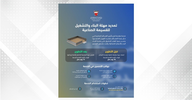 في إطار الجهود الحكومية لتطوير جودة الخدمات وإعادة هندستها، طوّرت وزارة الصناعة والتجارة خدمة تمديد مهلة البناء والتشغيل للقسيمة الصناعية، وتتيح هذه الخدمة لمستأجري القسائم الصناعية التقدم بطلب تمديد المهل الزمنية المرتبطة ببنود العقد، بما يشمل المدد اللازمة للحصول على رخصة البناء، والبدء بالأعمال الإنشائية، والشروع في تشغيل المصنع، وفق الضوابط المعتمدة، وذلك ضمن مساعيها المستمرة للارتقاء بمستوى الخدمات المقدمة وتعزيز كفاءة الإجراءات.