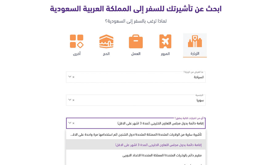 أظهرت منصة التأشيرات، التابعة لوزارة الخارجية السعودية، إمكانية تقديم السوريين المقيمين في دول مجلس التعاون الخليجي طلبات تأشيرة زيارة للمملكة بشكل إلكتروني، ضمن الخدمات الرقمية المتاحة عبر المنصة الرسمية.