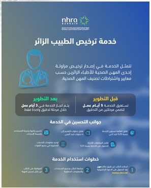 في إطار الجهود الحكومية المستمرة لتطوير جودة الخدمات وإعادة هندستها، طوّرت الهيئة الوطنية لتنظيم المهن والخدمات الصحية خدمة ترخيص الطبيب الزائر، وذلك بهدف تحسين تجربة العملاء في الحصول على خدمة إصدار ترخيص مزاولة إحدى المهن الصحية للأطباء الزائرين وفق معايير واشتراطات تصنيف المهن الصحية.