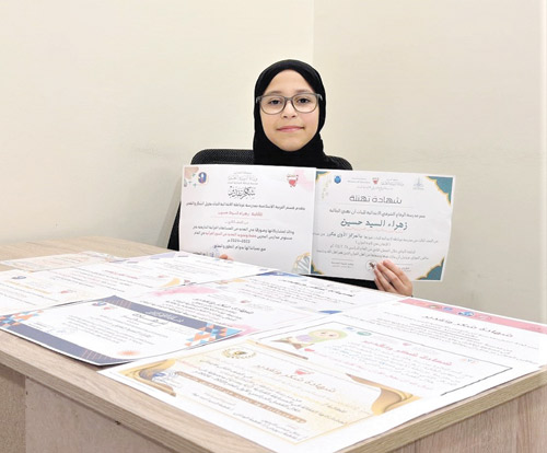 حصدت الطالبة زهراء السيد حسين حسن علي، من مدرسة غرناطة الابتدائية للبنات، 12 جائزة في المسابقات المدرسية الخاصة بحفظ وتلاوة القرآن الكريم، حتى الآن، نظير تميزها في هذا المجال، بدعم مدرستها وأسرتها.