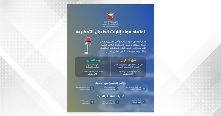 وفي هذا السياق، أكد السيد حسين أحمد آل شعيل وكيل شؤون الطيران المدني، أن تطوير هذه الخدمة يأتي في إطار تبني وزارة المواصلات والاتصالات حلولًا رقمية مبتكرة تعزز كفاءة الإجراءات، وترفع مستوى جودة الخدمات المقدمة للمستفيدين، بما يسهم في تسهيل إنجاز المعاملات وتقليل الوقت والجهد على المؤسسات والأفراد.