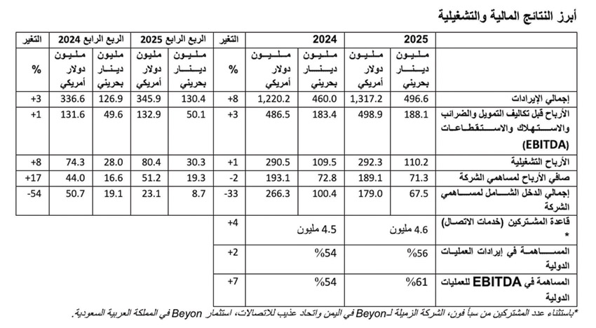 أعلنت شركة Beyon ش.م.ب. (رمز التداول: BEYON) أمس نتائجها المالية للربع الرابع والسنة المنتهية في 31 ديسمبر 2025. بلغ صافي الأرباح لمساهمي الشركة 19.3 مليون دينار بحريني (51.2 مليون دولار أمريكي) في الربع الرابع لعام 2025، أي بارتفاع نسبته 17% مقارنة مع 16.6 مليون دينار بحريني (44.0 مليون دولار أمريكي) للفترة ذاتها من عام 2024. وبلغت العائدات على السهم الواحد 11.7 فلسا في الربع الرابع من عام 2025، مقارنة مع 10.0 فلوس في الربع الرابع من عام 2024.