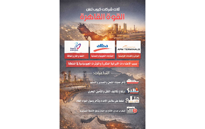 وأعلنت عدة شركات صناعية ولوجستية في البحرين حالة القوة القاهرة، من بينها شركة بابكو إنرجيز في قطاع الطاقة، وشركة ألمنيوم البحرين «ألبا» في قطاع الصناعات الثقيلة، إضافة إلى شركةAPM Terminals Bahrain المشغلة لـ ميناء خليفة، وذلك في ظل التحديات التي تواجه سلاسل الإمداد وحركة الملاحة والنقل في المنطقة.