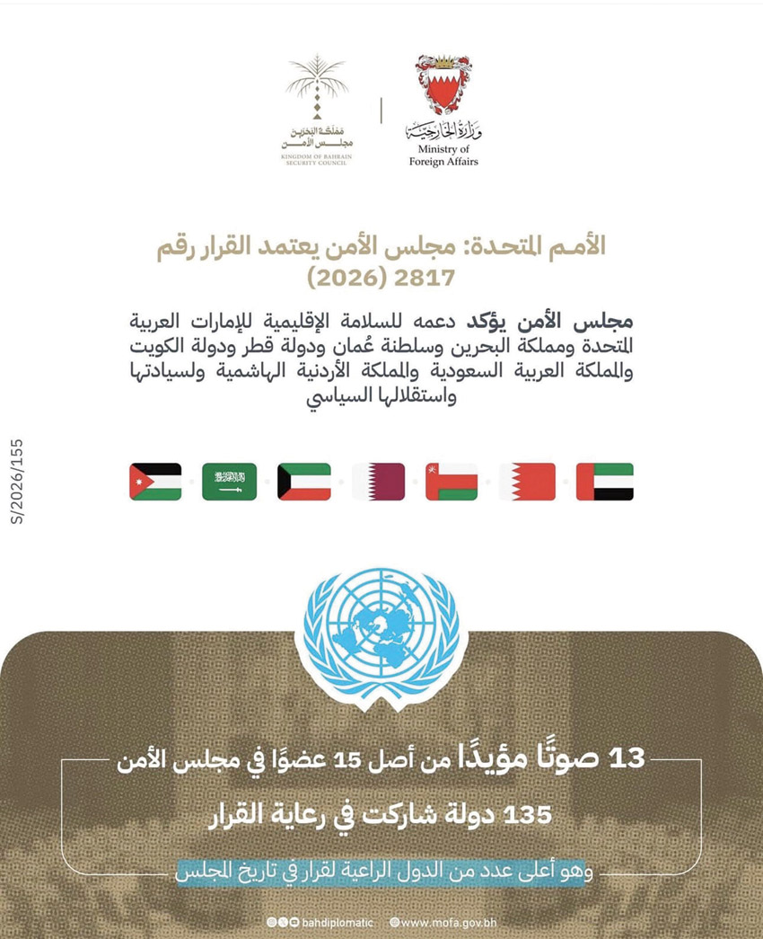 واختتم المندوب الدائم بتأكيد التزام مملكة البحرين الراسخ بمقاصد ومبادئ ميثاق الأمم المتحدة، واستمرار المملكة في العمل مع شركائها الإقليميين والدوليين لتعزيز الأمن والاستقرار في المنطقة، وصون ما عُرف عن دولنا من أمن وأمان وازدهار، على الرغم من مساعي من لا يشاطرنا هذا المسار في إبعادنا عنه.