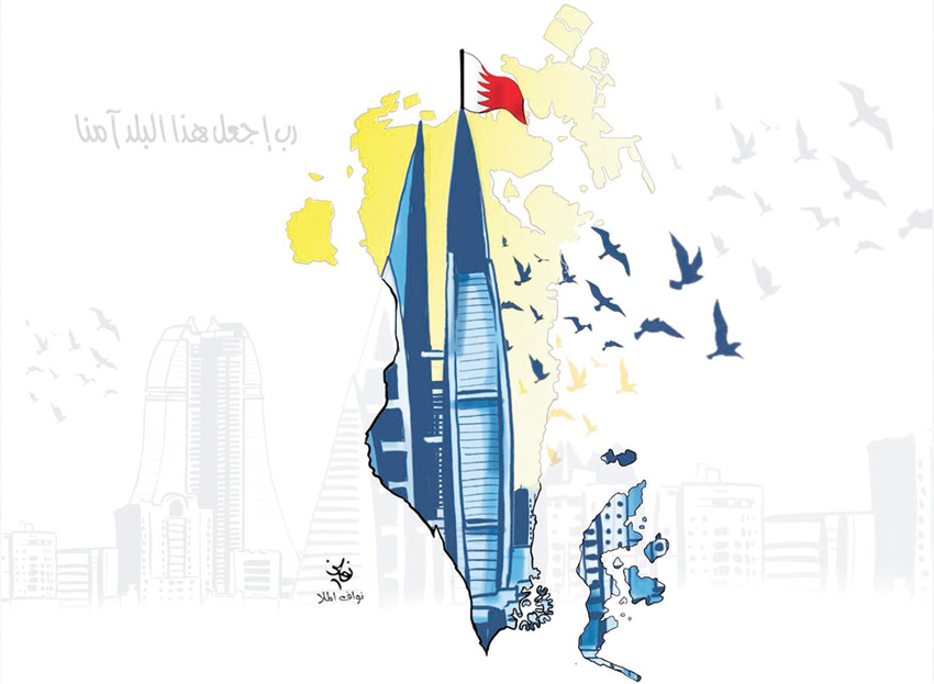 أما رسام الكاريكاتير نواف الملا فيظهر من خلال عمله الفني مرفأ البحرين المالي مهيمنا على جزيرة البحرين، مستقرا في المنتصف وشامخا في لحظة تنتهي فيها الحرب وتبقي المملكة بطاقتها وحيويتها التي عهدها عليها الجميع. ويستخدم الملا في عمله الفني رمزية الطيور في إشارة إلى السلام والاستقرار.
