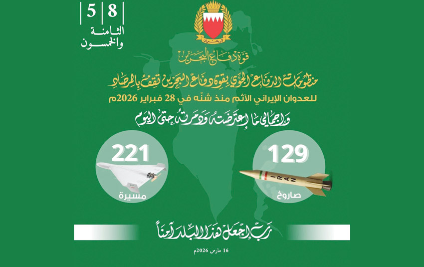 أعلنت القيادة العامة لقوة دفاع البحرين أن منظومات الدفاع الجوي بقوة دفاع البحرين بفضلٍ من الله ثم بيقظة رجالها مستمرة في مواجهة موجات تتابعية من الاعتداءات الإيرانية الإرهابية الآثمة، حيث تم منذ بدء الاعتداء الغاشم اعتراض وتدمير 129 صاروخا و221 طائرة مسيرة، استهدفت مملكة البحرين.