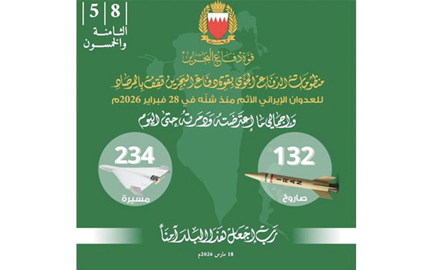 أعلنت القيادة العامة لقوة دفاع البحرين أن منظومات الدفاع الجوي بقوة دفاع البحرين بفضلٍ من الله ثم بيقظة رجالها مستمرة في مواجهة موجات تتابعية من الاعتداءات الإيرانية الإرهابية الآثمة، حيث تم منذ بدء الاعتداء الغاشم اعتراض وتدمير 132 صاروخا و234 طائرة مسيرة، استهدفت مملكة البحرين.