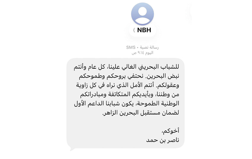 وجاء في نص الرسالة التي وصلت إلى الهواتف: «للشباب البحريني الغالي علينا، كل عام وأنتم نبض البحرين. نحتفي بروحكم وطموحكم وعقولكم. أنتم الأمل الذي نراه في كل زاوية من وطننا، وبأيديكم المتكاتفة ومبادراتكم الوطنية الطموحة، يكون شبابنا الداعم الأول لضمان مستقبل البحرين الزاهر».
