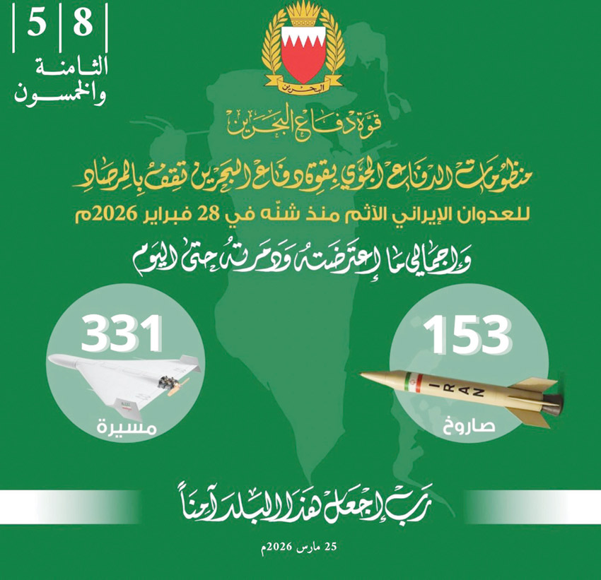 أعلنت القيادة العامة لقوة دفاع البحرين أن منظومات الدفاع الجوي بقوة دفاع البحرين بفضلٍ من الله ثم بيقظة رجالها مستمرة في مواجهة موجات تتابعية من الاعتداءات الإيرانية الإرهابية الآثمة؛ حيث تم منذ بدء الاعتداء الغاشم اعتراض وتدمير 153 صاروخا و331 طائرة مسيرة، استهدفت مملكة البحرين.