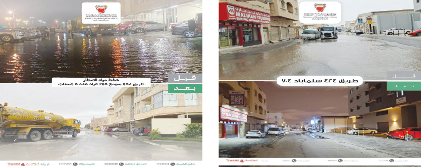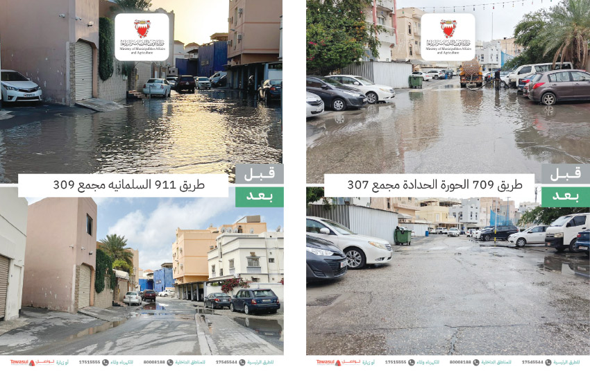 وفي التفاصيل، سجلت أمانة العاصمة رفع 1231 شحنة من تجمعات المياه، مقابل 162 بلاغًا. أما بلدية المحرق فقد تسلمت 407 بلاغات، وتمكنت من رفع 733 شحنة. وفي بلدية المنطقة الشمالية بلغ عدد البلاغات 527 بلاغًا، فيما تم رفع 2097 شحنة، في حين سجلت بلدية المنطقة الجنوبية 194 بلاغًا، وتمكنت الفرق الميدانية من رفع 2350 شحنة من تجمعات المياه.