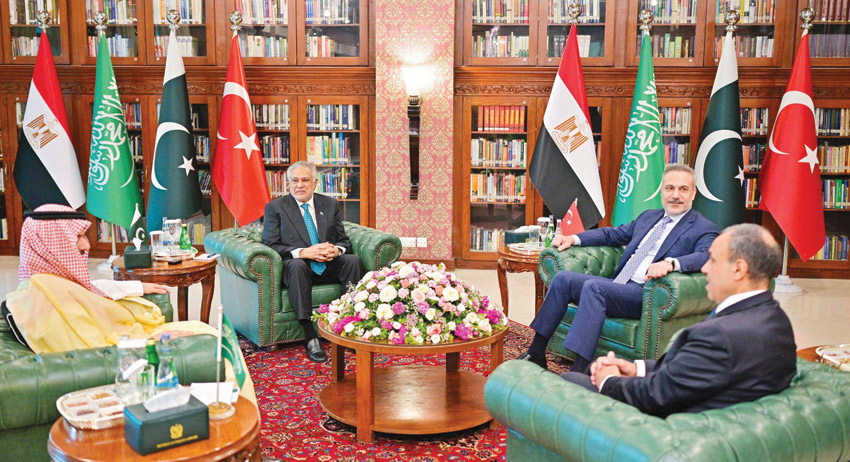 وأجرى إسحاق دار صباح أمس لقاءات منفصلة مع نظرائه، السعودي فيصل بن فرحان والمصري بدر عبد العاطي والتركي هاكان فيدان. ثمّ التقوا جميعاً قائد الجيش الباكستاني عاصم منير.