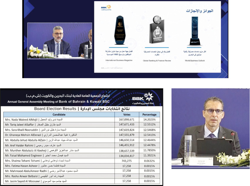 وعلى صعيد المسؤولية الاجتماعية، أشار إلى أن البنك استثمر نحو 2.4 مليون دينار بحريني في مبادرات مجتمعية متنوعة تشمل قطاعات الصحة والتعليم والرياضة، كما سجل موظفو البنك مئات الساعات من العمل التطوعي، إلى جانب توجيه نسبة كبيرة من الإنفاق إلى الموردين المحليين دعمًا للاقتصاد الوطني. وتطرق الشريفي إلى الاستحواذ على محفظة HSBC، مؤكدًا أنها شكلت خطوة استراتيجية ناجحة للبنك، حيث بلغت قيمة المحفظة عند الاستحواذ نحو 27 مليون دينار بحريني، فيما تجاوز تقييمها اليوم 50 مليون دينار بحريني، ما يعكس تحقيق عوائد قوية وتعزيز المركز التنافسي للبنك في السوق. كما أشار إلى أن الاندماج مع بنك البحرين الوطني يمثل محطة مهمة في مسيرة البنك، حيث يسهم في تطوير الكوادر البشرية، وإطلاق خدمات مصرفية جديدة، وتعزيز التوسع في أسواق الخليج، بما يدعم تحقيق نمو مستدام على المدى الطويل. وأسفرت انتخابات مجلس الإدارة للدورة الجديدة (مارس 2026 – مارس 2029) عن فوز كل من: ندى وليد المعجل، طارق جليل الصفار، سارة خليل نور الدين، د. غنية الدرازي، عبدالله جهاد الزين، عارف رحيمي، منذر عبدالعزيز الكوهجي، بعضوية مجلس الإدارة. وفي ختام الاجتماع، أكد مجلس الإدارة والإدارة التنفيذية مواصلة تنفيذ استراتيجية البنك القائمة على النمو المستدام والابتكار والتحول الرقمي، مع التركيز على تعزيز العوائد للمساهمين وتوسيع نطاق الأعمال، بما يعزز مكانة البنك في القطاع المصرفي على المستويين المحلي والإقليمي.