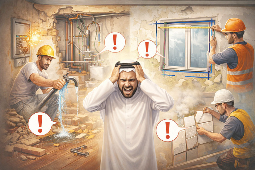 من جانبه سرد (ع.س) قصته مع ترميم منزله، مشيرا إلى أنه لا يزال يعاني مع المقاول الذي ينفذ أعمال الترميم. ولفت إلى أن العقد ينص على إنهاء الأعمال خلال ثلاثة أشهر، ولكن المدة ستصل إلى الضعف من دون الانتهاء، وأضاف: لاحظنا أن المقاول لا يمتلك عمالة ثابتة وإنما يجمعهم بشكل عشوائي. ولأن الكثير منهم غير محترف، فإن هذا يتسبب في كثير من المشاكل والأخطاء، منها عمل انحناء الأرضية والكاشي في المنزل إلى الداخل وليس إلى المخارج، بحيث تتجمع المياه في زوايا المنزل. كما نفذوا أرضية الكراج بشكل مائل، بحيث تبقى فجوة كبيرة جدا عند إغلاق باب الكراج، وهو ما يسمح بدخول الأتربة والحشرات. وعندما خاطبت المقاول، اضطر إلى تكسير الكاشي والرخام، وإعادة تنفيذه مرة أخرى، ولكن خسرت أنا قيمة الكاشي الجديد.