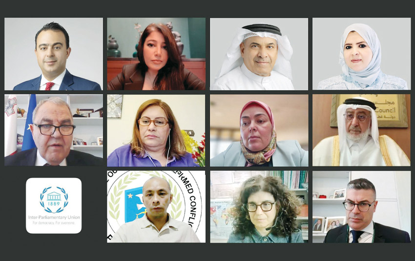 ومثّل وفد الشعبة البرلمانية المشارك في الندوة الافتراضية، المحامية دلال جاسم الزايد، رئيس لجنة الشؤون التشريعية والقانونية بمجلس الشورى، والنائب حسن عيد بوخماس، رئيس لجنة الشؤون الخارجية والدفاع والأمن الوطني بمجلس النواب، وعلي عبدالله العرادي، عضو مجلس الشورى، والدكتورة مريم صالح الظاعن عضو مجلس النواب. وبمشاركة عدد من البرلمانيين وخبراء دوليين ومختصين.
