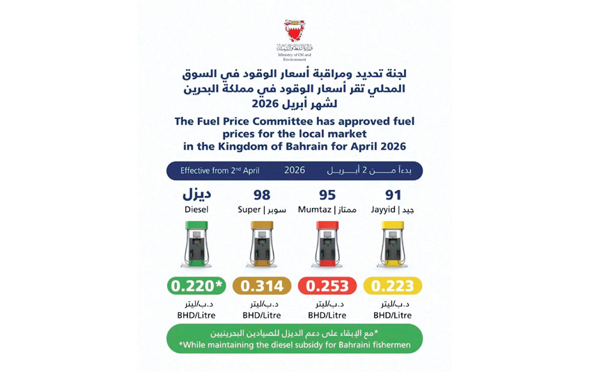 أقرت لجنة تحديد ومراقبة أسعار الوقود في مملكة البحرين أسعار الوقود لشهر أبريل 2026، مسجلةً ارتفاعات متفاوتة مقارنة بأسعار شهر فبراير الماضي، مع الإبقاء على دعم الديزل للصيادين البحرينيين.