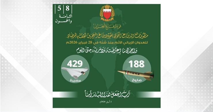 تعلن القيادة العامة لقوة دفاع البحرين أن منظومات الدفاع الجوي بقوة دفاع البحرين بفضلٍ من الله، ثم بيقظة رجالها مستمرة في مواجهة موجات تتابعية من الاعتداءات الإيرانية الإرهابية الآثمة حيث تم منذ بدء الاعتداء الغاشم اعتراض وتدمير 188 صاروخ و429 طائرة مسيرة، استهدفت مملكة البحرين.