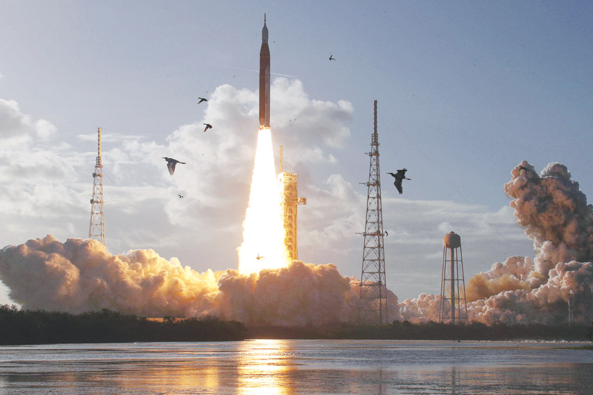وانطلق الصاروخ «سبايس لانش سيستم» (اس ال اس) في الموعد المحدد عند الساعة 18:35 (22:35 بتوقيت غرينتش) من مركز كينيدي للفضاء في فلوريدا. وبعد دقائق معدودة، هتف قائد المهمة الأمريكي ريد وايزمان «نشهد شروقا رائعا للقمر!».