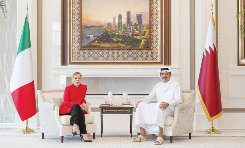 الدوحة – (أ ف ب): بحثت رئيسة الحكومة الإيطالية جورجيا ميلوني مع أمير قطر الشيخ تميم بن حمد آل ثاني، أمس في الدوحة، أزمة الطاقة التي تسبّبت بها الحرب في الشرق الأوسط، بحسب ما أفاد مكتبها.