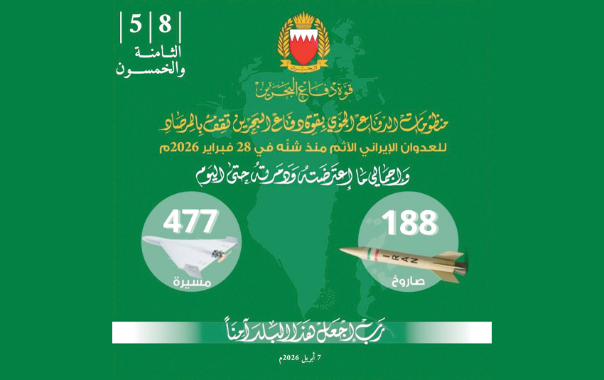 أعلنت القيادة العامة لقوة دفاع البحرين أن منظومات الدفاع الجوي بقوة دفاع البحرين بفضلٍ من الله ثم بيقظة رجالها مستمرة في مواجهة الاعتداءات الإيرانية الإرهابية الآثمة، حيث تم منذ بدء الاعتداء الغاشم اعتراض وتدمير 188 صاروخا و477 طائرة مسيرة، استهدفت مملكة البحرين.