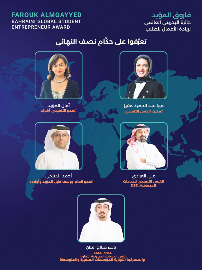 وتشمل لجنة التحكيم السيدة آمال المؤيد، المدير التنفيذي في شركة أشرف، والسيدة مها عبدالحميد مفيد الرئيس التنفيذي لصندوق العمل «تمكين»، والسيد أحمد الديلمي المدير العام في شركة يوسف خليل المؤيد وأولاده، والسيد علي العرادي الرئيس التنفيذي للخدمات المصرفية في بنك البحرين للتنمية، إلى جانب السيد ناصر صلاح التتان رئيس الخدمات المصرفية التجارية والمؤسسات الصغيرة والمتوسطة. كما يشرف على تنظيم البرنامج فريق فاروق المؤيد البحرينية العالمية لريادة الأعمال الطلابية في منظمة رواد الأعمال في مملكة البحرين، بقيادة السيد بوب ثاكر، رئيس البرنامج، والسيدة رينوكا رافيندران، الرئيس المشارك للبرنامج، وبمساندة السيد فريد بدر، رئيس منظمة رواد الأعمال في مملكة البحرين، والسيدة كريستينا توليدو، مديرة الفرع. وفي هذا السياق، صرح السيد بوب ثاكر، رئيس برنامج جوائز ريادة الأعمال الطلابية العالمية في منظمة رواد الأعمال في مملكة البحرين، بالقول: «نحرص في منظمة رواد الأعمال في مملكة البحرين على استقطاب نخبة من الكفاءات والخبرات المتميزة لعضوية لجنة التحكيم، لما لذلك من دور محوري في ضمان جودة التقييم وتعزيز مستوى المنافسة بين المشاركين. ويعكس تنوع خلفيات أعضاء اللجنة ثراء الخبرات التي سيستفيد منها الطلبة المشاركون».