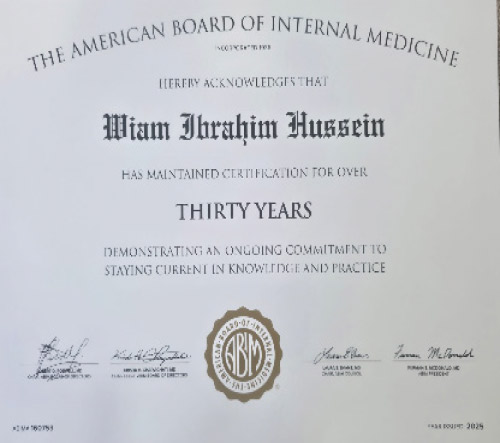 حصل استشاري أمراض السكري والغدد الصماء في مملكة البحرين الدكتور وئام إبراهيم حسين على شهادة تقدير من المجلس الأمريكي للطب الباطني (American Board of Internal Medicine)، وذلك تقديراً لإكماله ثلاثين عاماً متواصلة من برنامج المحافظة على شهادة البورد الأمريكي (Maintenance of Certification)، وهو برنامج يعكس الالتزام المستمر بالتعليم الطبي المتقدم وتطبيق أحدث المعايير العالمية في رعاية مرضى السكري والغدد الصماء.