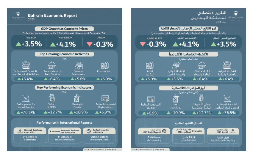 نشرت وزارة المالية والاقتصاد الوطني أمس التقرير الاقتصادي لمملكة البحرين لعام 2025 عبر موقعها الإلكتروني www.mofne.gov.bh.