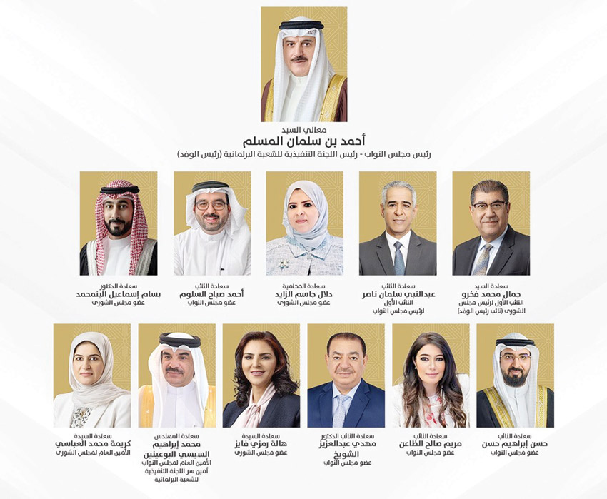 ويترأس الوفد أحمد بن سلمان المسلم رئيس مجلس النواب رئيس اللجنة التنفيذية للشعبة البرلمانية، فيما يضم الوفد الأعضاء: جمال فخرو النائب الأول لرئيس مجلس الشورى نائب رئيس الوفد، والنائب عبدالنبي سلمان النائب الأول لرئيس مجلس النواب، والمحامية دلال الزايد عضو مجلس الشورى، والنائب أحمد السلوم، والدكتور بسام البنمحمد عضو مجلس الشورى، والنائب حسن إبراهيم، والنائب مريم الظاعن، والنائب الدكتور مهدي الشويخ، وهالة رمزي عضو مجلس الشورى، والمهندس محمد السيسي البوعينين الأمين العام لمجلس النواب أمين سر اللجنة التنفيذية للشعبة البرلمانية، وكريمة العباسي الأمين العام لمجلس الشورى.