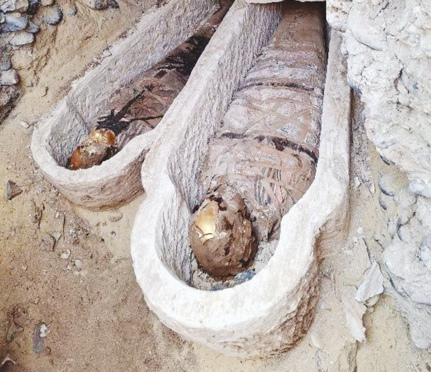 وذكرت الوزارة في بيان أن المومياوات «بعضها ملفوف بلفائف مزخرفة بزخارف هندسية»، مشيرة إلى أن البعثة عثرت أيضا على «ثلاثة ألسنة ذهبية، وآخر من النحاس، فضلا عن وجود دلائل على استخدام رقائق الذهب على بعض المومياوات».