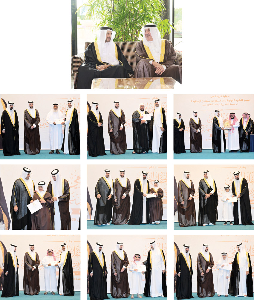 برعاية كريمة من سمو الشيخة لولوة بنت خليفة بن سلمان آل خليفة الرئيسة الفخرية لجمعية النور للبر، نظمت جمعية النور للبر الحفل الختامي للدورة السادسة لجائزة صاحب السمو الملكي الأمير خليفة بن سلمان آل خليفة القرآنية –رحمه الله تعالى– أمس بقاعة الغزال بفندق الريتز كارلتون بمنطقة السيف، وبحضور لفيف من أصحاب السمو والمعالي والسعادة والمسؤولين بالدولة.
