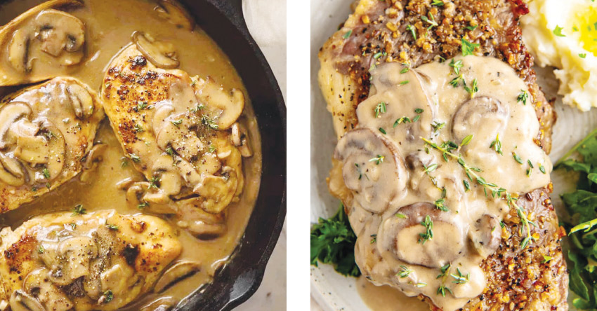 ويقدم إلى جانب الطبق صلصة الفطر بالكريمة، حيث يستخدم الفطر الأبيض أو البني الذي يشوح مع الزبدة والثوم لإبراز نكهاته الطبيعية العميقة، قبل إضافة الكريمة السائلة التي تمنح الصلصة قواماً مخملياً غنياً. ويمكن تعزيز النكهة بإضافة مرق الدجاج وجبن البارميزان، ما يضفي عمقاً إضافياً على المذاق.