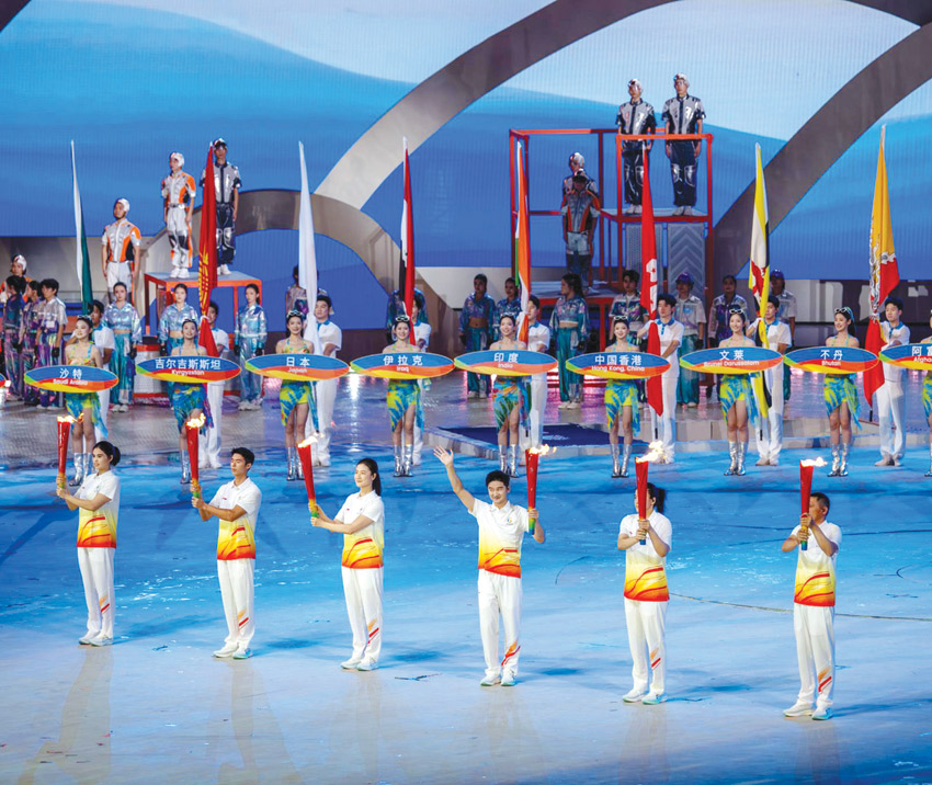 وانطلق الحفل بمراسم رسمية بدأت بدخول علم جمهورية الصين الشعبية وعزف سلامها الوطني، أعقبها أداء قسم اللاعبين والحكام، قبل أن تتوالى الفقرات الاستعراضية في عرض فني متكامل قدم عبر ثلاثة فصول متتابعة، وصولًا إلى اللحظة الأبرز بإشعال الشعلة الأولمبية التي تجسدت في تصميم مبتكر على هيئة الشمس، في رمز يعكس روح الحياة والطاقة التي تحتضنها المدينة الساحلية.