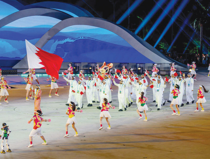 وتميز الطابور البحريني بحضور منظم ولافت، فقد ارتدى الوفد الزي الشعبي الرسمي ورفعت أعلام المملكة في أجواء احتفالية، واستثمر أعضاء البعثة هذه اللحظة للتعريف بالبحرين أمام مختلف الوفود، في وقت حظيت فيه البعثة بتحية حارة من الجماهير الحاضرة، في دلالة واضحة على ما تحظى به الرياضة البحرينية من تقدير واحترام في المحافل الدولية.