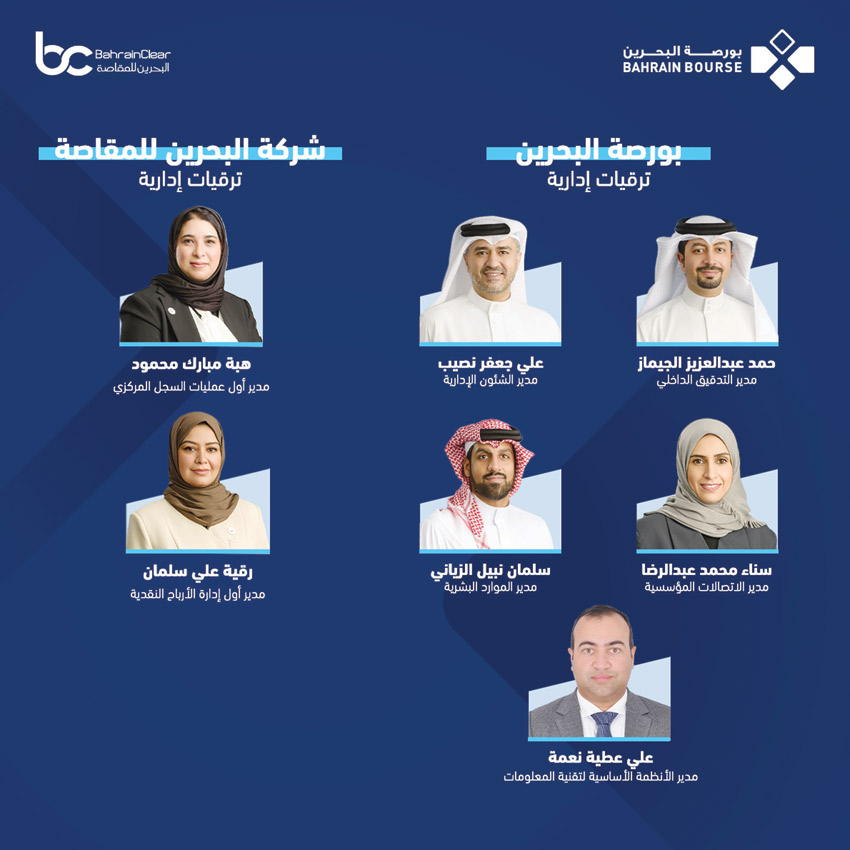 أعلنت بورصة البحرين وشركتها التابعة والمملوكة لها بالكامل، شركة البحرين للمقاصة ترقية عدد من موظفيها إلى مناصب إدارية، وذلك تقديرًا لأدائهم المتميز، وتفانيهم في العمل، وإسهاماتهم المستمرة في تعزيز نجاح المؤسسة.